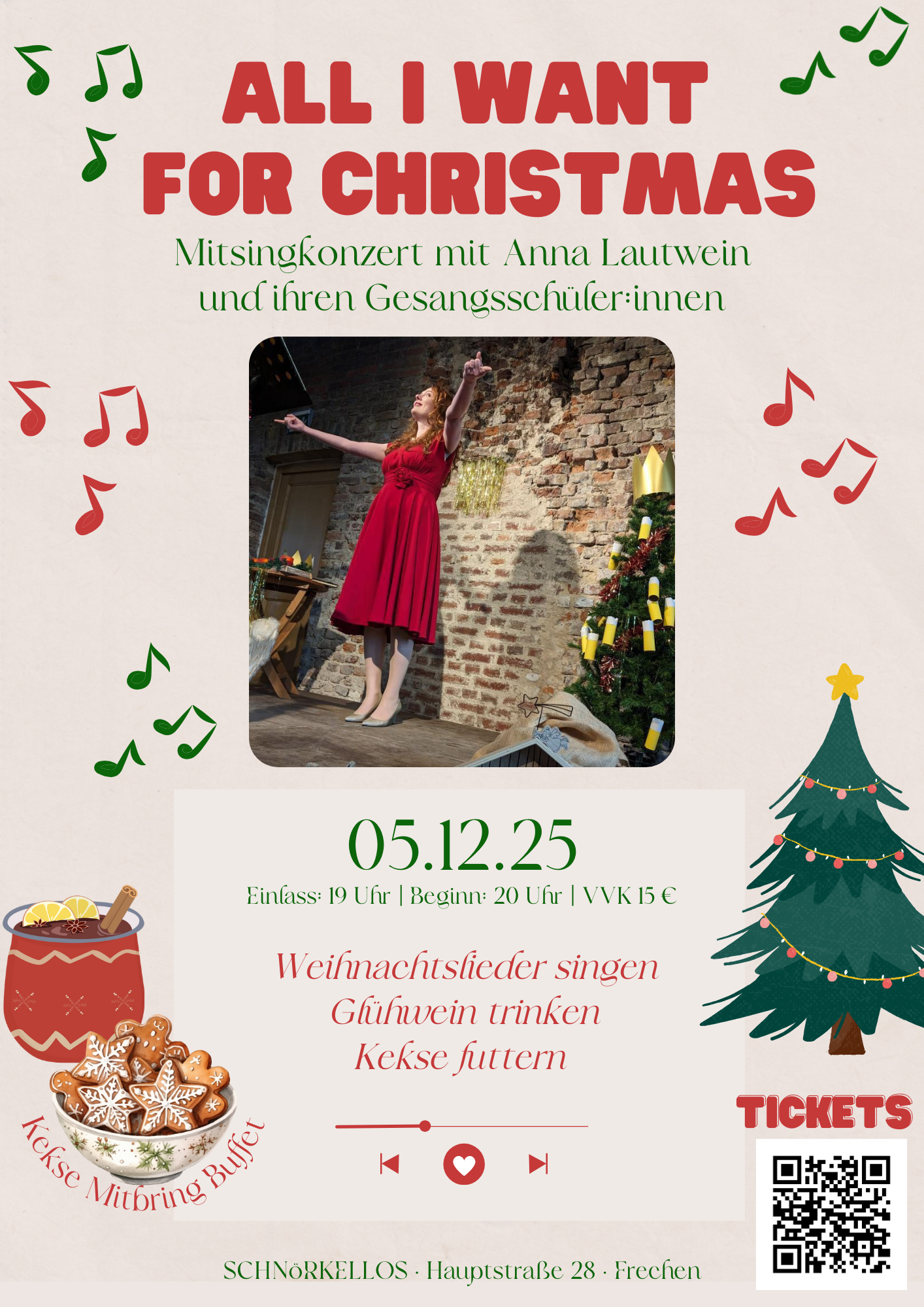 Am 05.12.25 laden wir euch herzlich zu unserem ALL I WANT FOR CHRISTMAS Mitsingkonzert mit der wunderbaren Anna Lautwein und ihren Gesangsschüler:innen ein! ?