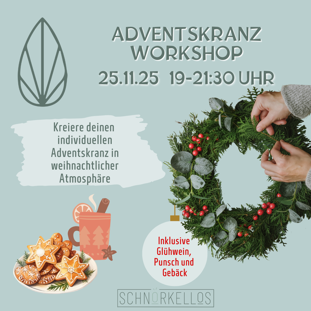 Der Workshop ist ideal für alle, Die sich in weihnachtliche Stimmung bringen und kreativ werden möchten. Egal, ob Du gerade erst anfängst oder schon Erfahrung im Kranzbinden hast – alle sind herzlich willkommen! Komm vorbei, wenn Du Lust auf eine festliche, kreative Auszeit hast und Deinen eigenen Adventskranz gestalten möchtest – und bring am besten Deine Freund:innen gleich mit.
